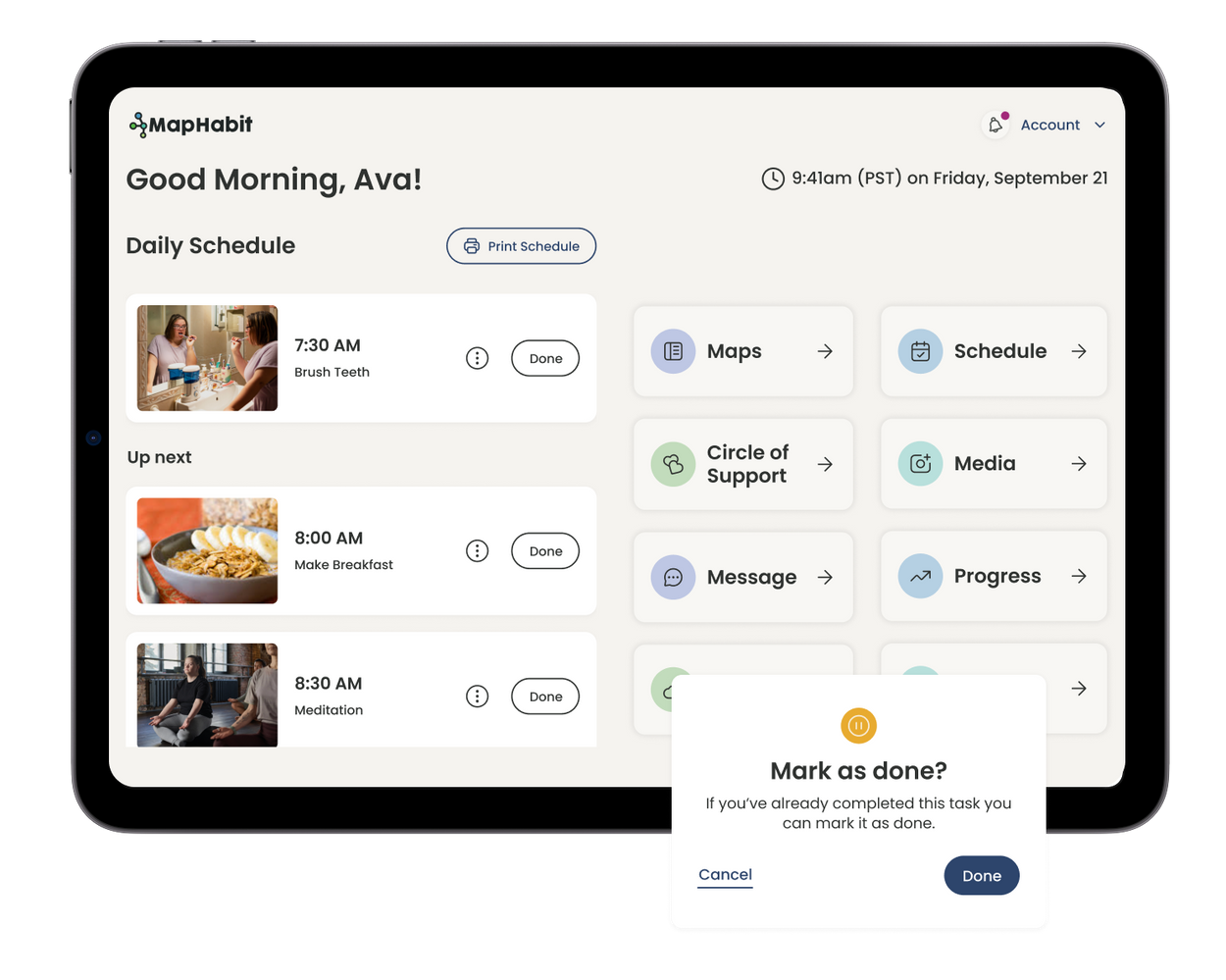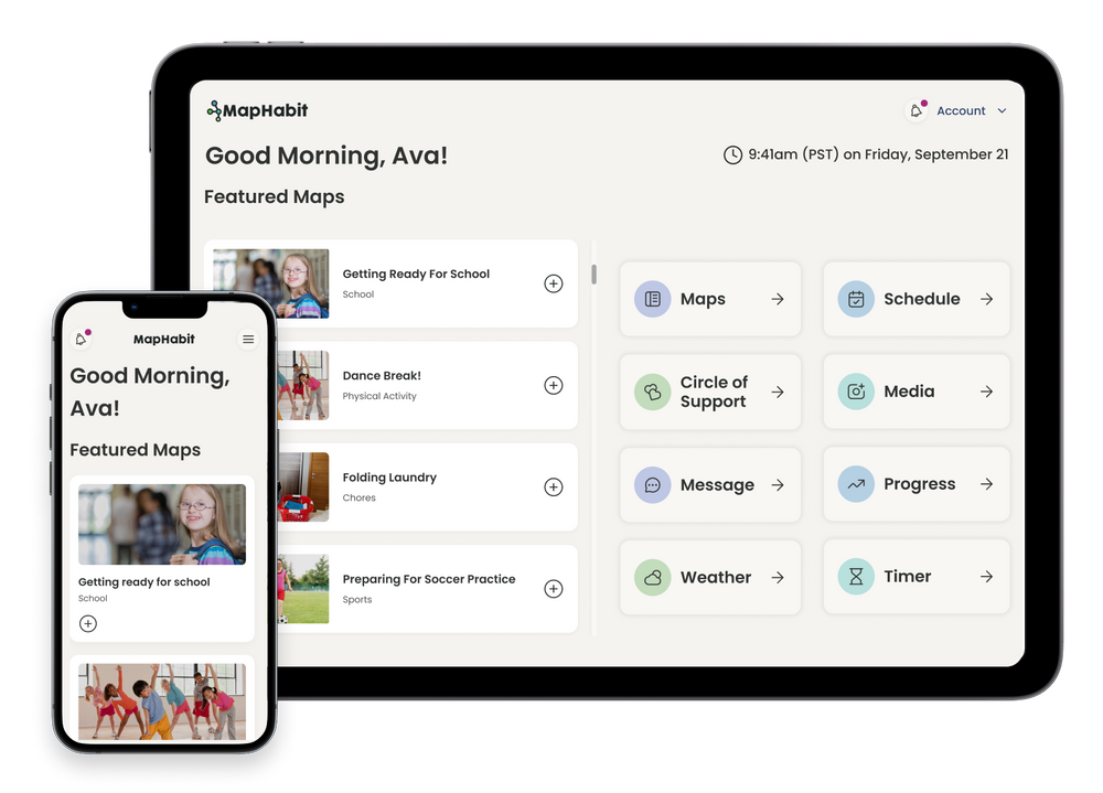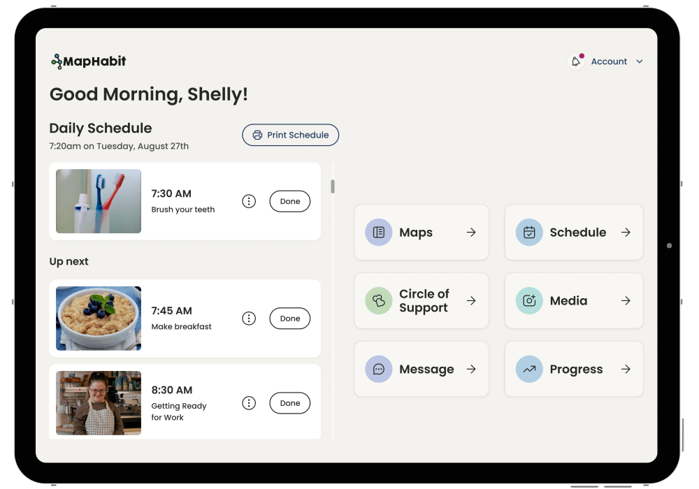 “Previously reliant on constant verbal cues, our member, [a 7-year-old boy with autism], now independently follows a step-by-step routine with the [MapHabit] tablet, managing tasks from breakfast to showering. With decreased assistance needed, he responds effectively to alarms for specific tasks, demonstrating improved understanding and independence.”
